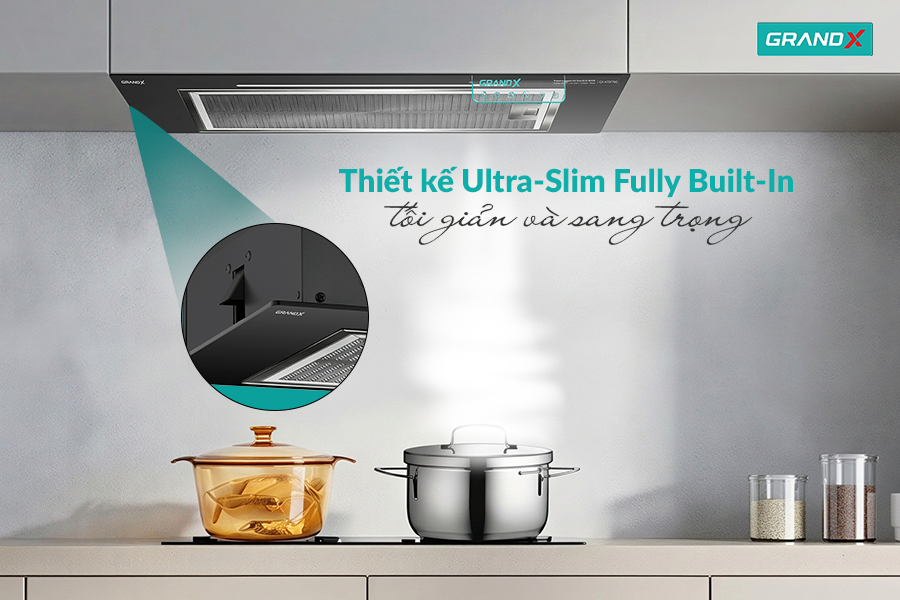 Điểm nổi bật đầu tiên của Hút mùi GX H70F79G là thiết kế Ultra-slim fully built-in – lắp âm hoàn toàn trong tủ bếp, giúp không gian bếp gọn gàng, sang trọng và hiện đại.
