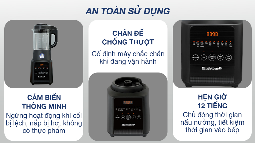 - Máy làm sữa hạt đa năng BlueStone có kết cấu chắc chắn, sắc đen thời thượng, giúp tô điểm cho không gian bếp thêm đẹp mắt.