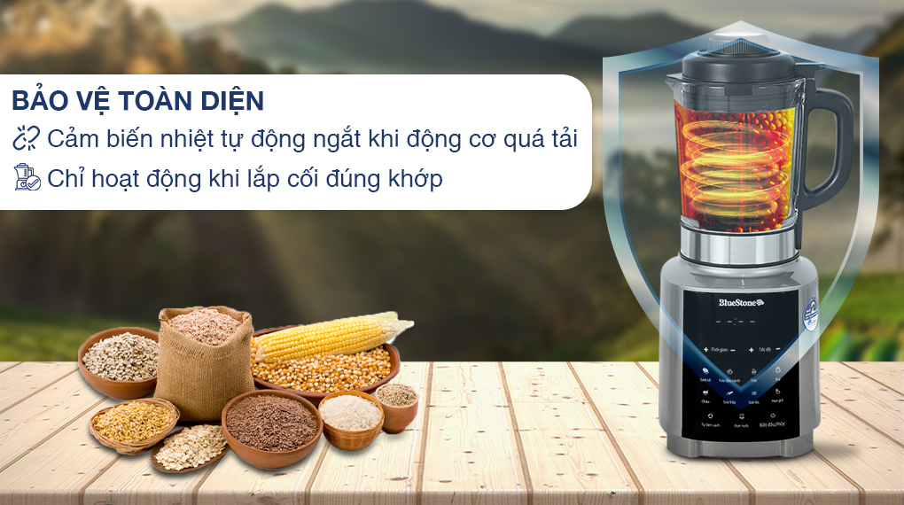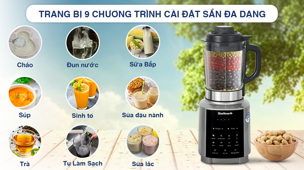 - Máy làm sữa hạt đa năng BlueStone trang bị 9 chương trình cài đặt sẵn: sữa đậu nành, sữa bắp, súp, đun trà, cháo, đun nước, sinh tố, sữa lắc, tự làm sạch, giúp người dùng dễ dàng lựa chọn chương trình phù hợp với nhu cầu và nguyên liệu chế biến.