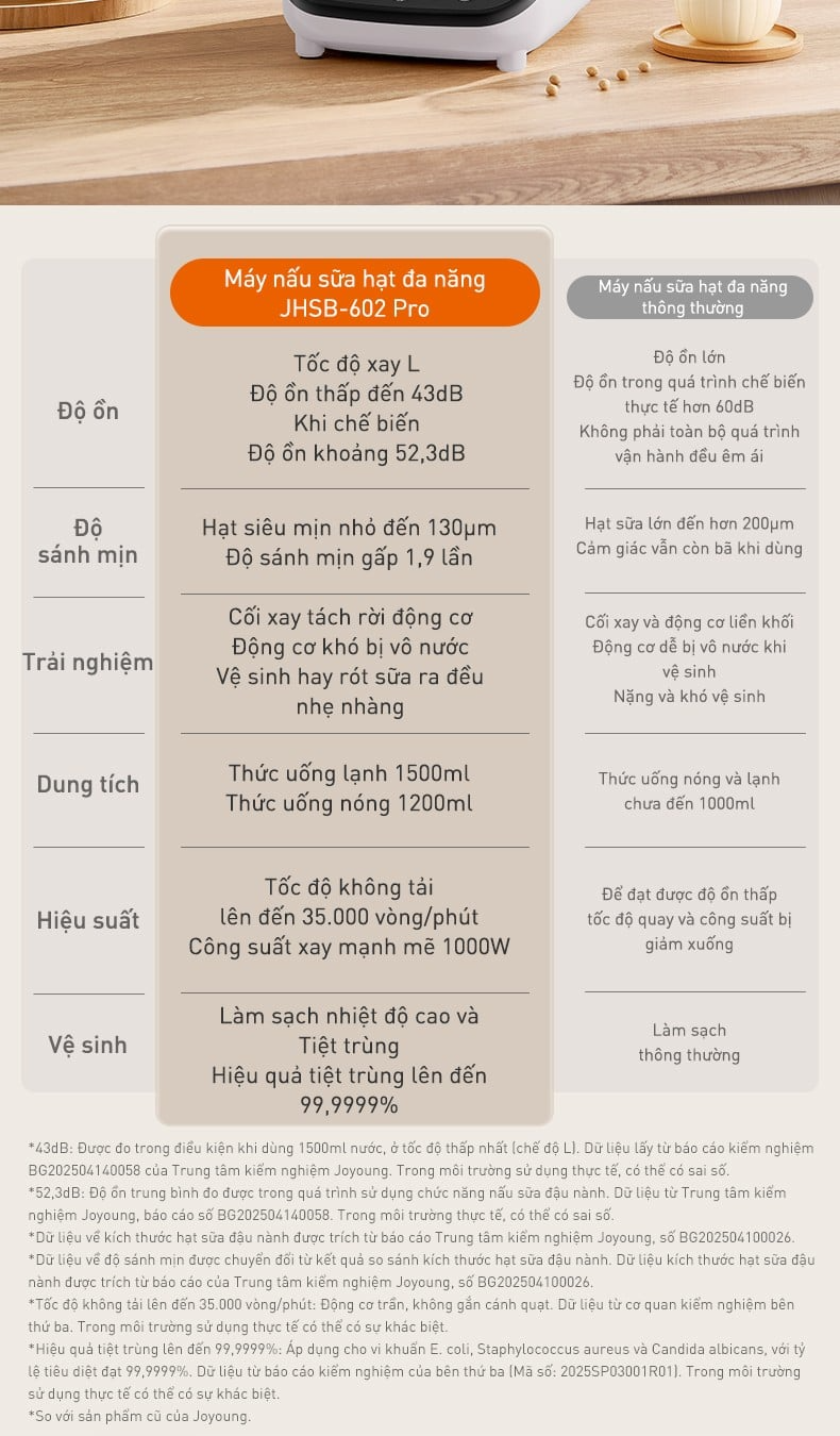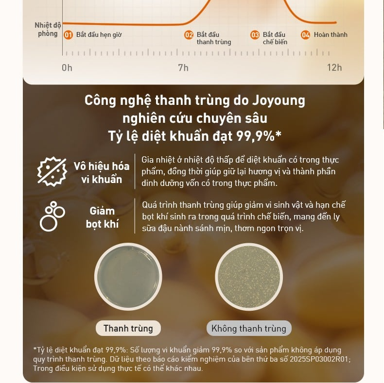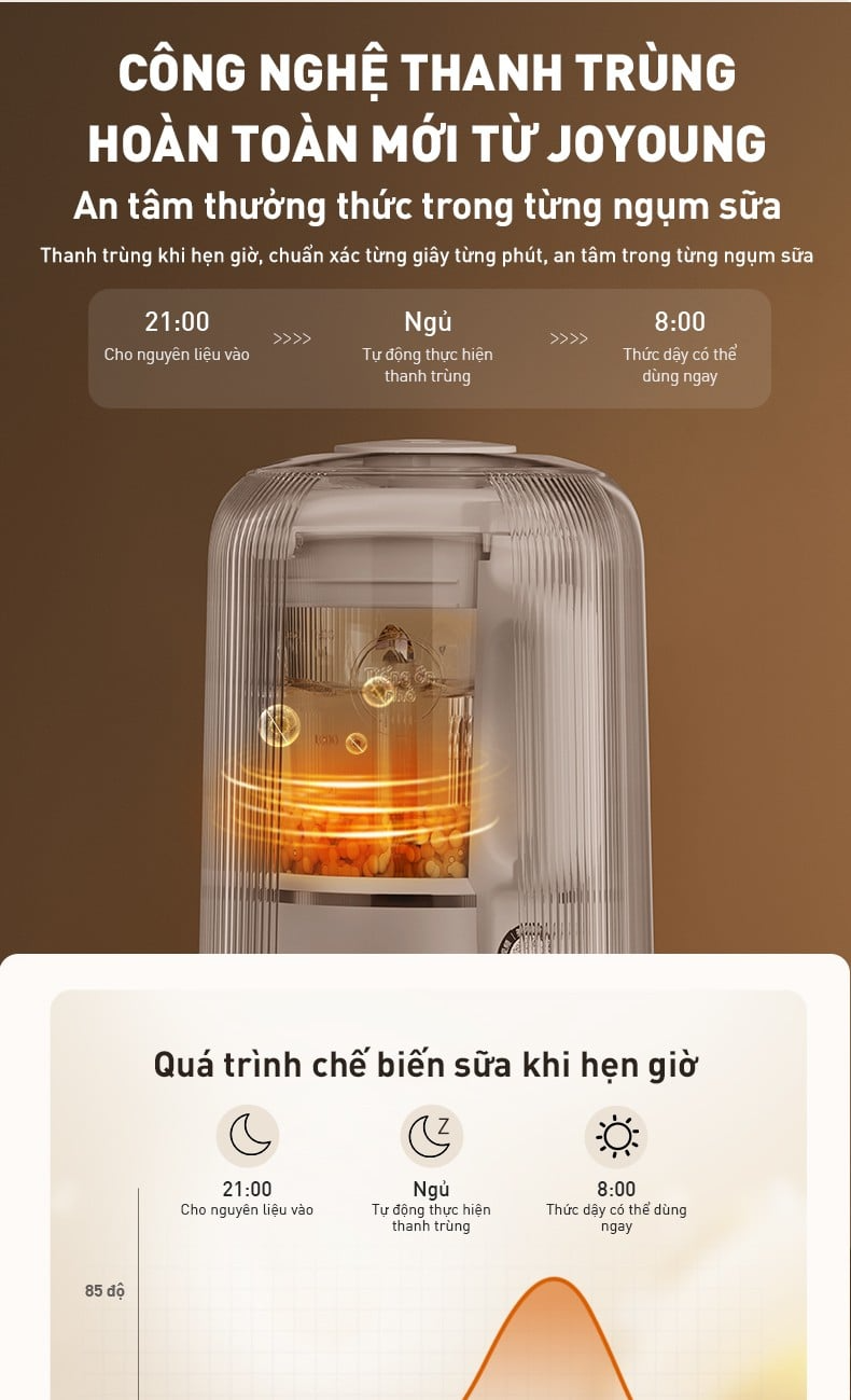 Để khắc phục hạn chế này, máy nấu sữa hạt đa năng Joyoung JHSB-602 Pro được trang bị công nghệ thanh trùng tiên tiến do Joyoung nghiên cứu độc quyền (khi người dùng thiết lập chế độ hẹn giờ trên 6 tiếng, máy sẽ tự động kích hoạt gia nhiệt tới 85°C, kết hợp với chuyển động khuấy chậm để diệt khuẩn và giảm bọt khí). Tỷ lệ diệt khuẩn đạt 99,9% giúp thành phẩm sau khi nấu sánh mịn, tươi mới và thơm ngon hơn, đem lại an tâm khi sử dụng.