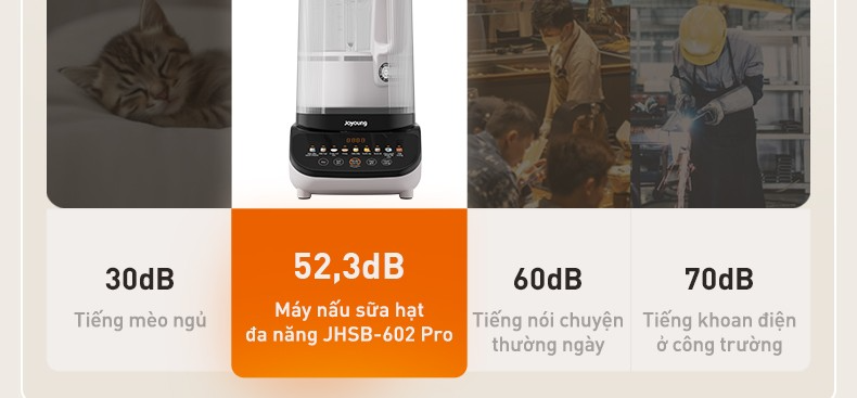 Máy nấu sữa hạt đa năng Joyoung JHSB-602 Pro được trang bị công nghệ giảm ồn đa tầng tiên tiến, giúp triệt tiêu hiệu quả tiếng ồn ngay từ nguồn phát. Hệ thống cách âm nhiều lớp giúp máy vận hành êm ái trong khoảng 43–58dB. Bạn có thể yên tâm sử dụng máy vào sáng sớm hay buổi tối mà vẫn giữ không gian yên tĩnh, dễ chịu.