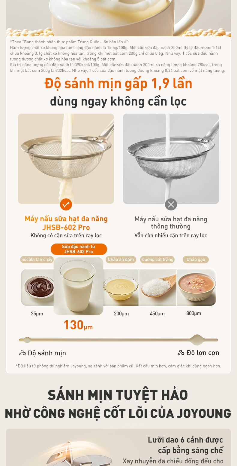 Máy nấu sữa hạt Joyoung JHSB-602 Pro cho ra thành phẩm chất sữa mịn màng gấp 1,9 lần, kích thích vị ngọt đậm sâu và thơm hơn nhờ vào động cơ xoay mạnh mẽ và lưỡi dao 6 cánh thiết kế độc quyền dễ dàng phá vỡ cấu trúc tế bào của hạt, giúp hỗn hợp được xay nhuyễn mịn hoàn toàn.