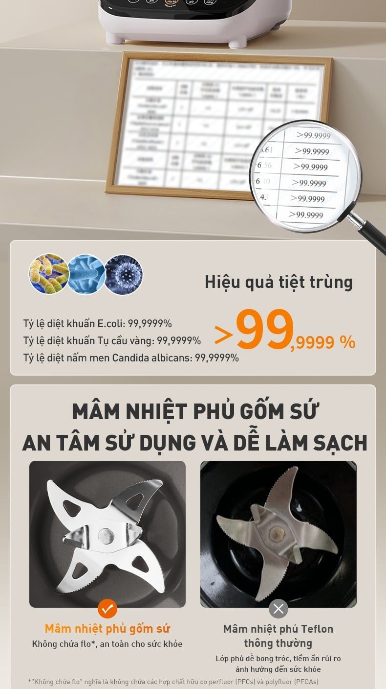 Chế độ tiệt trùng của máy đạt hiệu quả diệt khuẩn lên đến 99,9999%, loại bỏ các vi sinh vật gây hại phổ biến như E.Coli, Staphylococcus aureus và Candida albicans. Nhờ đó, cối xay luôn được duy trì trong trạng thái sạch khuẩn, không mùi lạ, an toàn cho sức khỏe của cả gia đình.