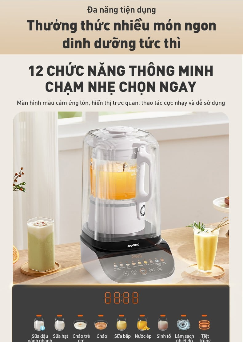 Máy tích hợp 12 chức năng đa dạng, bao gồm 7 chế độ nấu chuyên biệt, đáp ứng hầu hết nhu cầu chế biến trong gia đình. Từ nấu sữa đậu nành nhanh cho mỗi sáng, cháo ăn dặm cho bé, cho đến xay sinh tố, nước ép đều nhanh gọn và tiện lợi. Joyoung JHSB-602 còn hỗ trợ chức năng nghiền bột khi sử dụng cùng cối xay khô chuyên dụng từ Joyoung (phụ kiện mua riêng sẽ được cập nhật trong thời gian sớm nhất). Sở hữu dung tích lớn 1,2L cho thức uống nóng và 1,5L cho thức uống lạnh, JHSB-602 Pro có thể phục vụ thức uống bổ dưỡng cho cả gia đình chỉ trong một lần nấu.