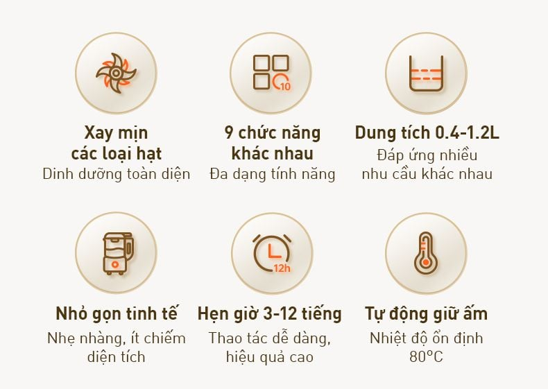 Máy nấu sữa hạt với 9 chức năng khác nhau giúp bạn có thể làm vô vàn các món ngon, dinh dưỡng cho gia đình từ: sữa hạt, cháo, soup cho đến các loại nước uống khác nhau.