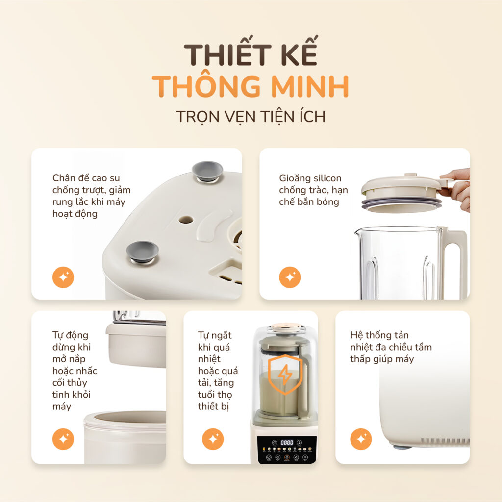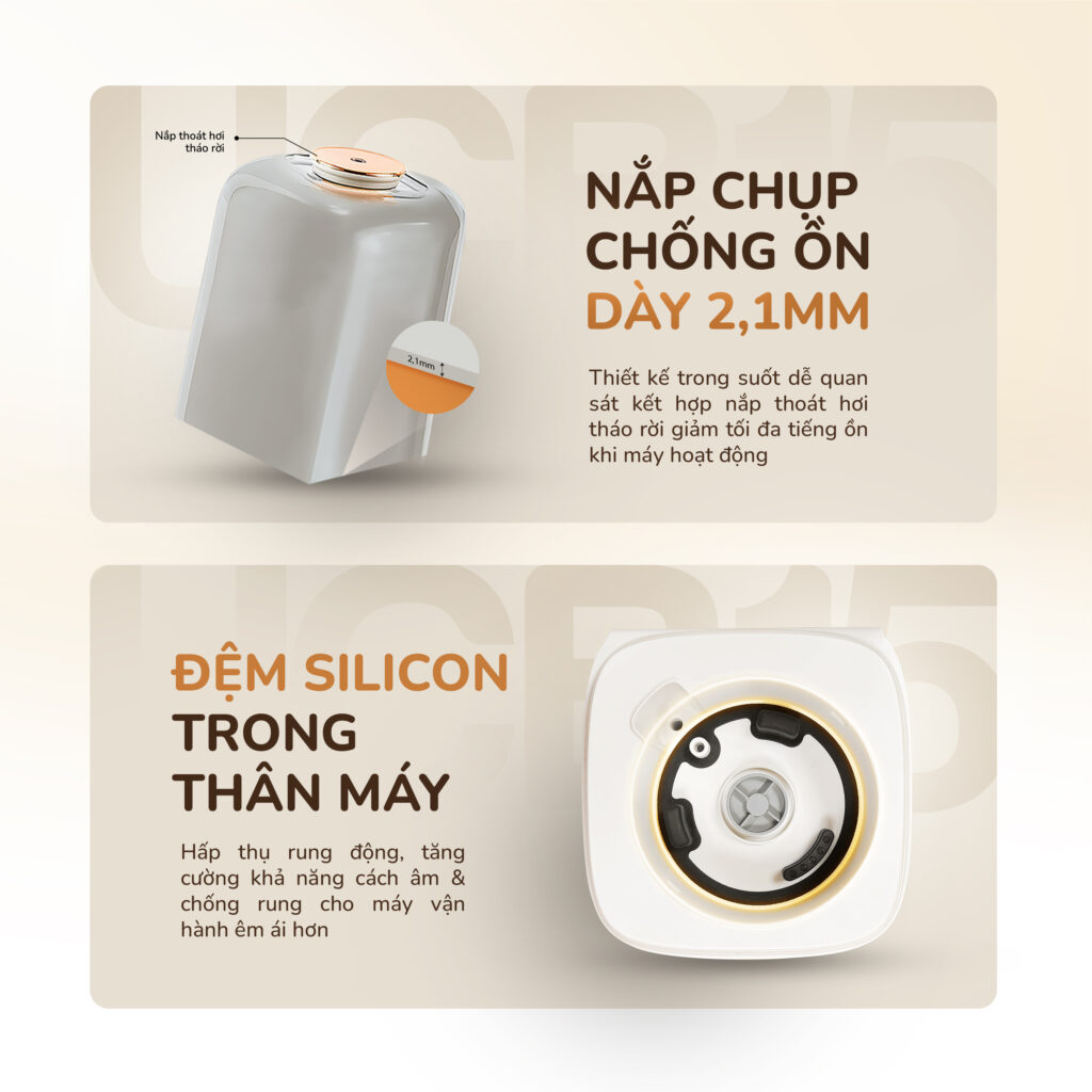 Nhờ trang bị nắp chụp chống ồn dày 2,1mm, máy có thể hạn chế đáng kể âm thanh phát ra trong quá trình xay và nấu. Thiết kế trong suốt của nắp giúp người dùng dễ dàng quan sát bên trong mà không cần mở nắp, nắp thoát hơi tháo rời giúp kiểm soát áp suất và giảm tiếng ồn hiệu quả. Đặc biệt, phần đệm silicon bên trong thân máy đóng vai trò hấp thụ rung động, tăng cường cách âm và chống rung, giúp máy vận hành ổn định và êm ái hơn. Nhờ những cải tiến này, UNIE UCB15 trở thành lựa chọn lý tưởng cho những gia đình có người lớn tuổi, trẻ nhỏ hoặc những ai yêu thích sự yên tĩnh khi nấu nướng.