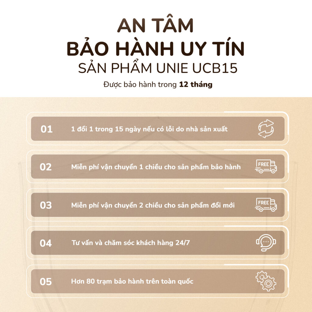 Với những tính năng an toàn vượt trội này, UNIE UCB15 mang đến trải nghiệm sử dụng vừa tiện lợi, vừa an tâm, phù hợp với mọi gia đình, đặc biệt là những gia đình có trẻ nhỏ hoặc người lớn tuổi.