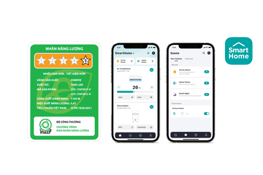 Kết nối Wi-Fi & SmartHome – Điều khiển từ xa qua điện thoại, theo dõi điện năng tiêu thụ, hỗ trợ điều khiển giọng nói.