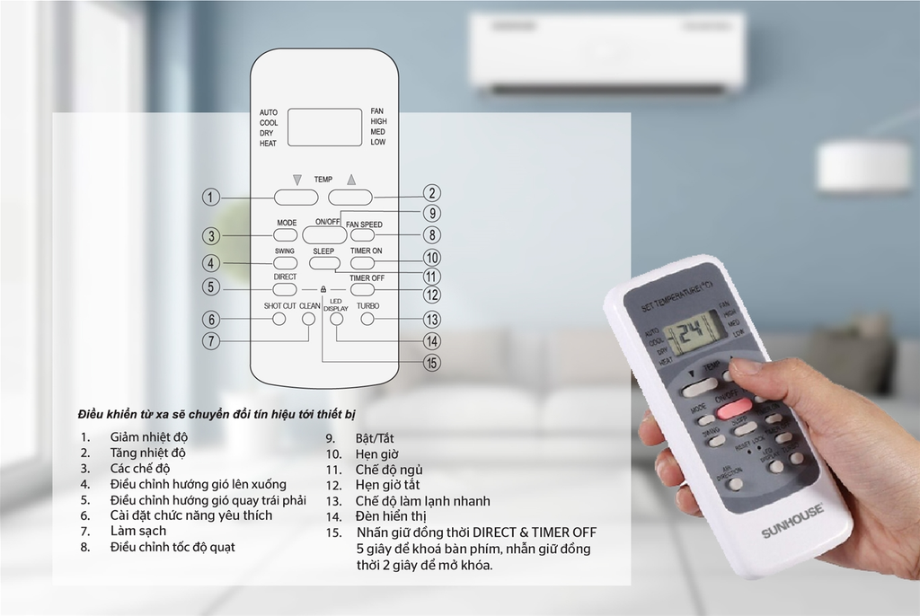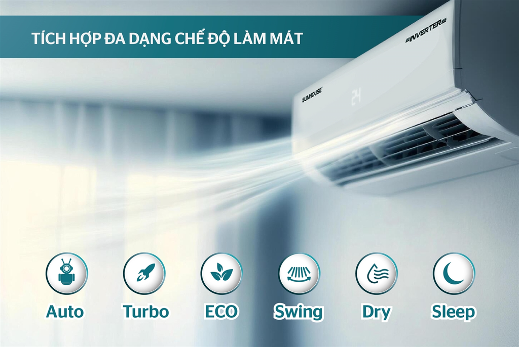 Không chỉ vậy, điều hòa Inverter SUNHOUSE còn được tích hợp nhiều chế độ làm mát đa dạng, đáp ứng tối đa nhu cầu sử dụng tại gia đình như: