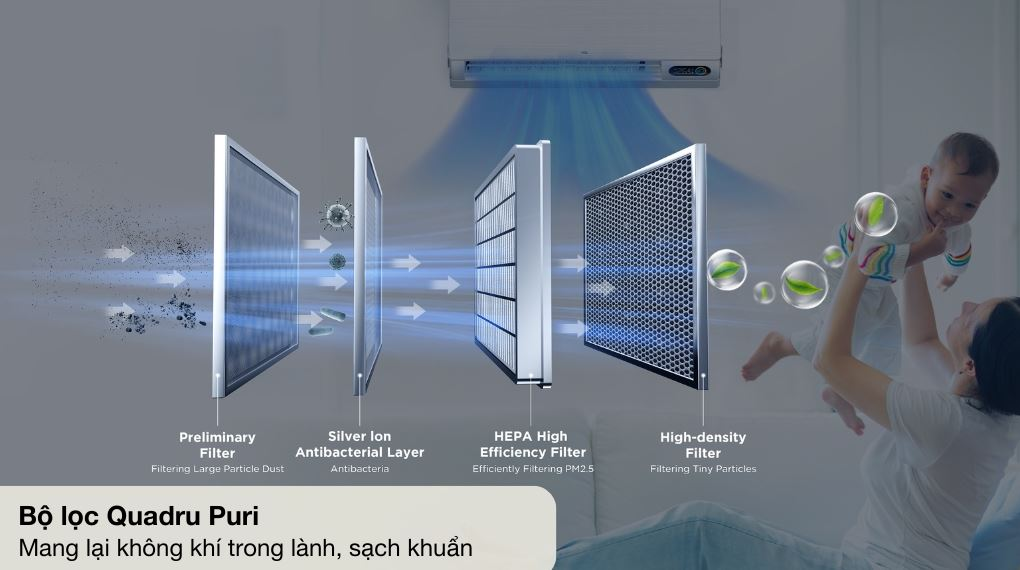 - Máy lạnh tích hợp bộ lọc Quadru Puri PM2.5 và hệ thống lọc 6 in 1 giúp loại bỏ bụi mịn, virus, vi khuẩn và mùi hôi – đặc biệt phù hợp với người nhạy cảm hoặc gia đình có trẻ nhỏ.