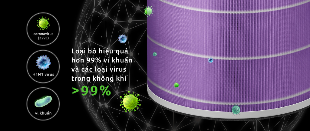 Sản phẩm sử dụng hệ thống lọc HEPA 4 trong 1 gồm màng lọc thô, HEPA Plus, HEPA H13 và than hoạt tính, giúp loại bỏ hiệu quả các loại bụi mịn từ PM0.1 đến PM10, đồng thời khử mùi, lọc khí độc hại và các tác nhân gây dị ứng trong không khí. Kết hợp cùng công nghệ ion âm và đèn LED UV-C, máy hỗ trợ tiêu diệt vi khuẩn, vi rút, mang lại bầu không khí sạch sâu và an toàn hơn cho sức khỏe.