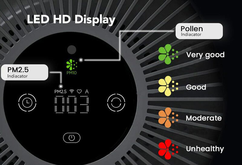 Máy được tích hợp màn hình LED HD hiển thị các thông tin quan trọng như mức bụi mịn PM2.5, chế độ hoạt động và trạng thái kết nối. Hệ thống đèn màu giúp người dùng dễ dàng nhận biết mức độ ô nhiễm không khí: