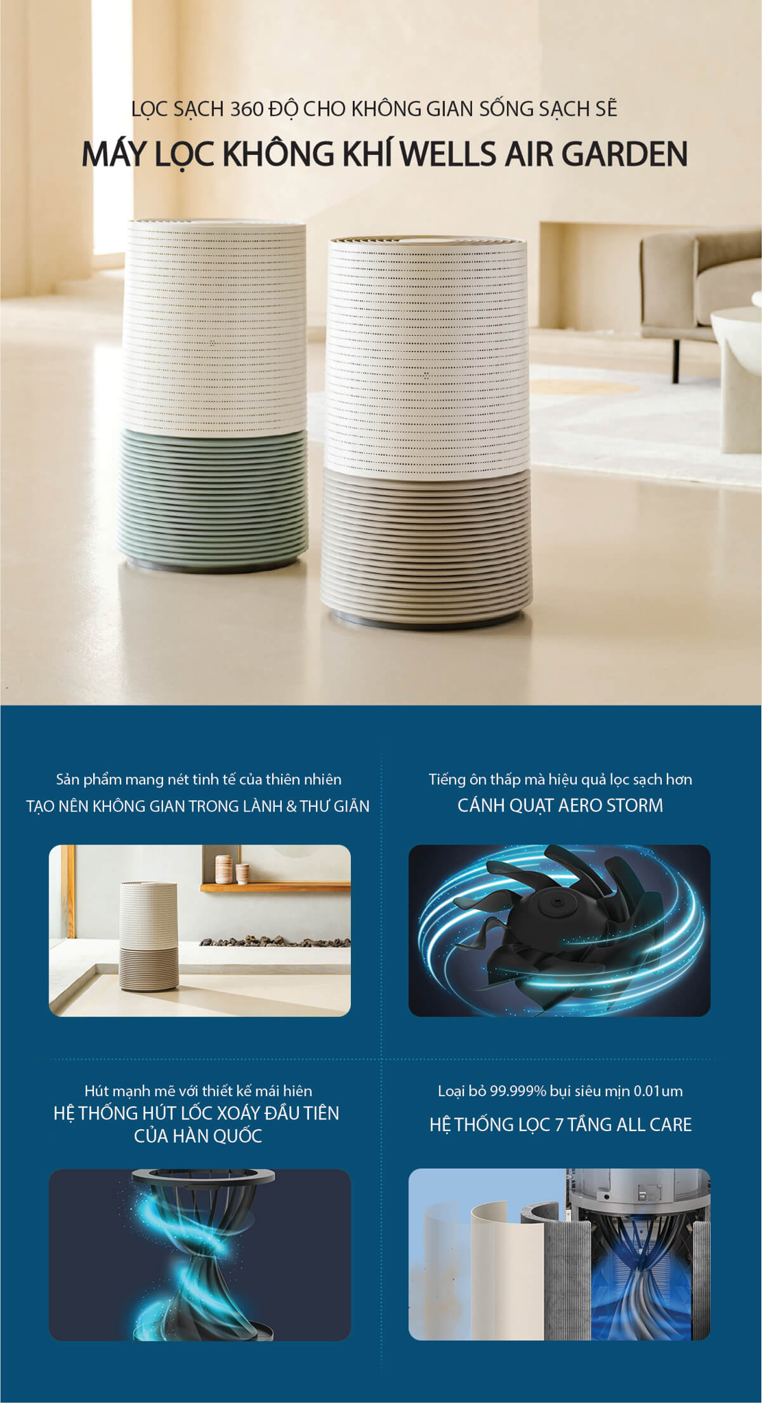 Máy lọc không khí Wells Air Garden là lựa chọn phổ biến cho các gia đình sống tại căn hộ và chung cư nhờ vào thiết kế nhỏ gọn, nhẹ nhàng và dễ di chuyển. Sản phẩm được trang bị công nghệ cảm biến tiên tiến và hệ thống lọc 7 tầng All Care, có khả năng loại bỏ tới 99,999% bụi mịn PM2.5, vi khuẩn, virus và các tác nhân gây hại khác. Điều này giúp tạo ra một môi trường không khí trong lành và an toàn cho sức khỏe.