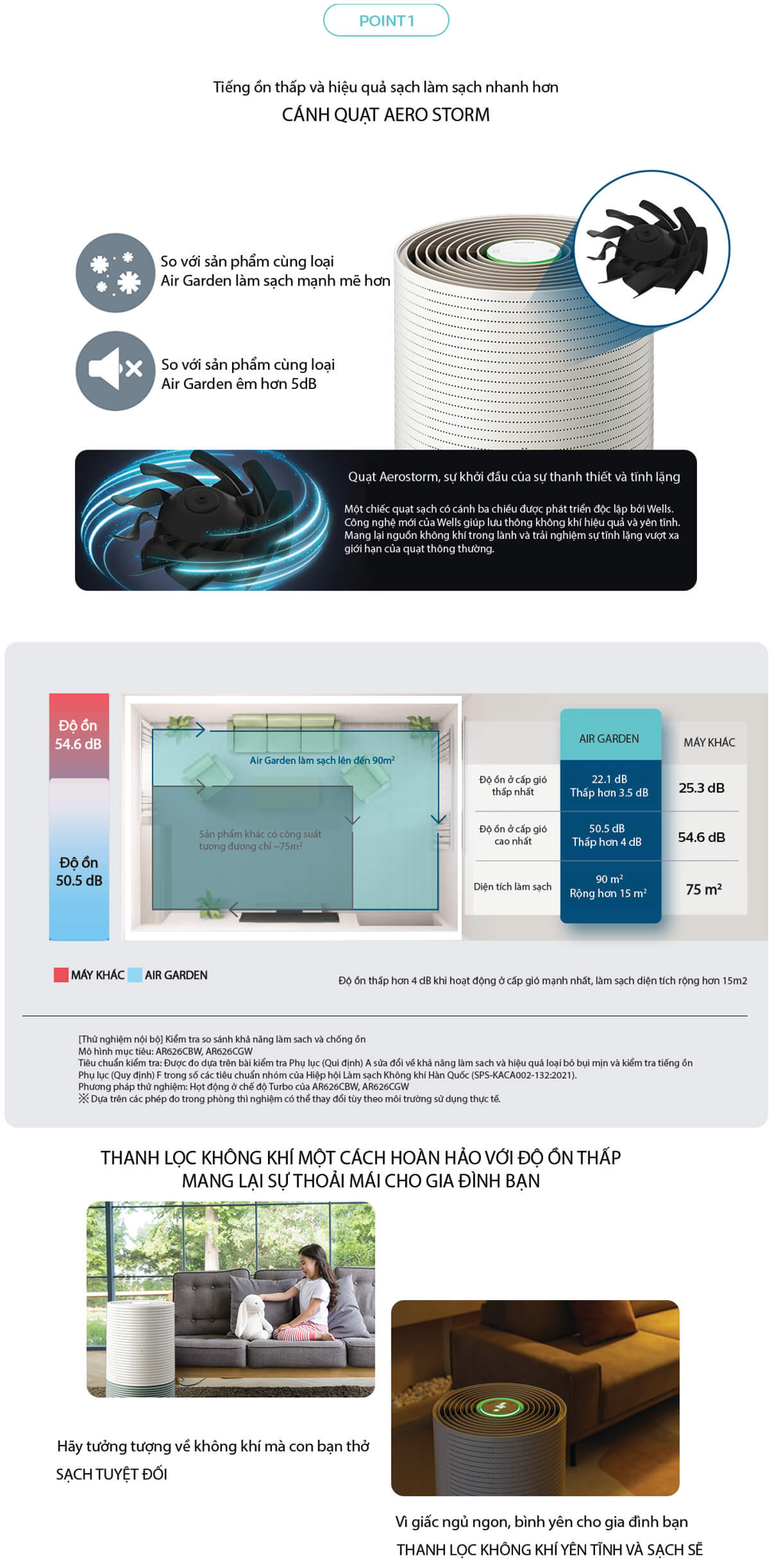 Máy lọc không khí Wells Air Garden được trang bị hệ thống quạt AERO STORM tiên tiến với cánh quạt 3 chiều do Wells phát triển độc lập. Hệ thống này giúp lưu thông không khí một cách hiệu quả và yên tĩnh, êm hơn 5dB so với các sản phẩm cùng dòng khác, đem lại không khí trong lành và trải nghiệm sự tĩnh lặng vượt trội. Ngoài ra, hệ thống hút lốc xoáy với cấu trúc hình nón đôi, được cấp bằng sáng chế, tạo ra luồng không khí quay mạnh mẽ, loại bỏ các chất có hại nhanh chóng và đều hơn 1,8 lần so với các máy lọc không khí thông thường. Sản phẩm đã vinh dự nhận được giải thưởng quốc tế IF của Đức, một trong ba giải thưởng thiết kế hàng đầu thế giới.