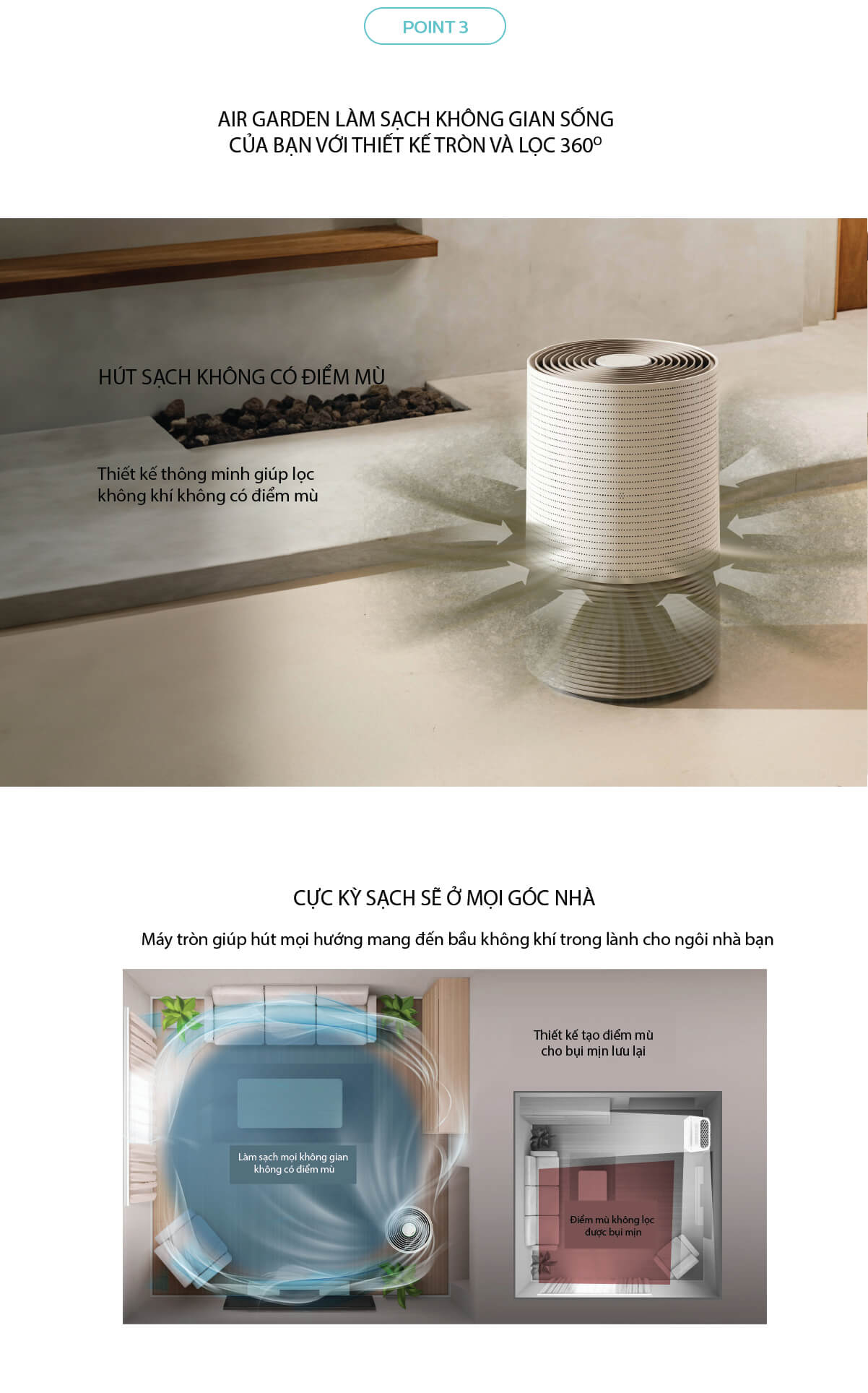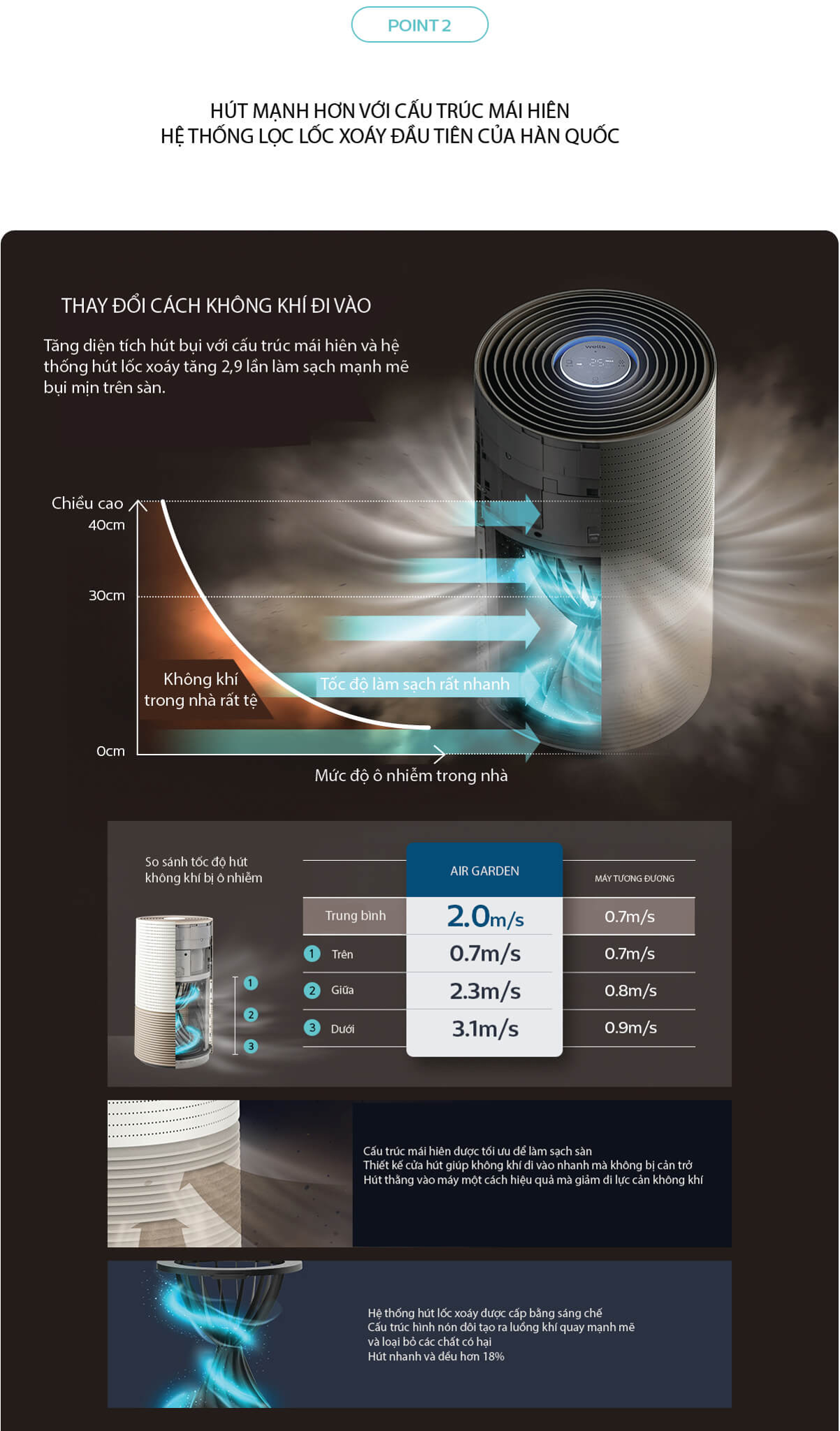 Máy lọc không khí Wells Air Garden sở hữu thiết kế mái hiên độc đáo kết hợp với hệ thống hút lốc xoáy, giúp tăng diện tích hút bụi lên gấp 2,9 lần so với các sản phẩm khác có cùng công suất. Thiết kế này không chỉ cải thiện khả năng hút bụi trên sàn nhà mà còn đảm bảo không khí được lọc sạch 360 độ trong không gian sống, giảm thiểu lực cản không khí và tăng hiệu suất lọc bụi.