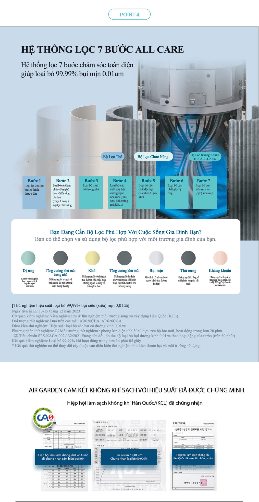 Máy được trang bị hệ thống lọc 7 tầng All Care tiên tiến, giúp loại bỏ đến 99,999% bụi mịn PM1.0 và PM2.5, cùng với vi khuẩn, virus, nấm mốc, phấn hoa và các chất gây dị ứng khác. Sự kết hợp giữa màng lọc than hoạt tính và màng lọc HEPA giúp khử mùi hôi, loại bỏ khí độc hại, VOC và bụi siêu mịn trong không khí, tạo ra môi trường sống trong lành và an toàn hơn. Bên cạnh đó, màng lọc thô giúp loại bỏ bụi bẩn, lông thú cưng và các hạt lớn khác một cách hiệu quả.