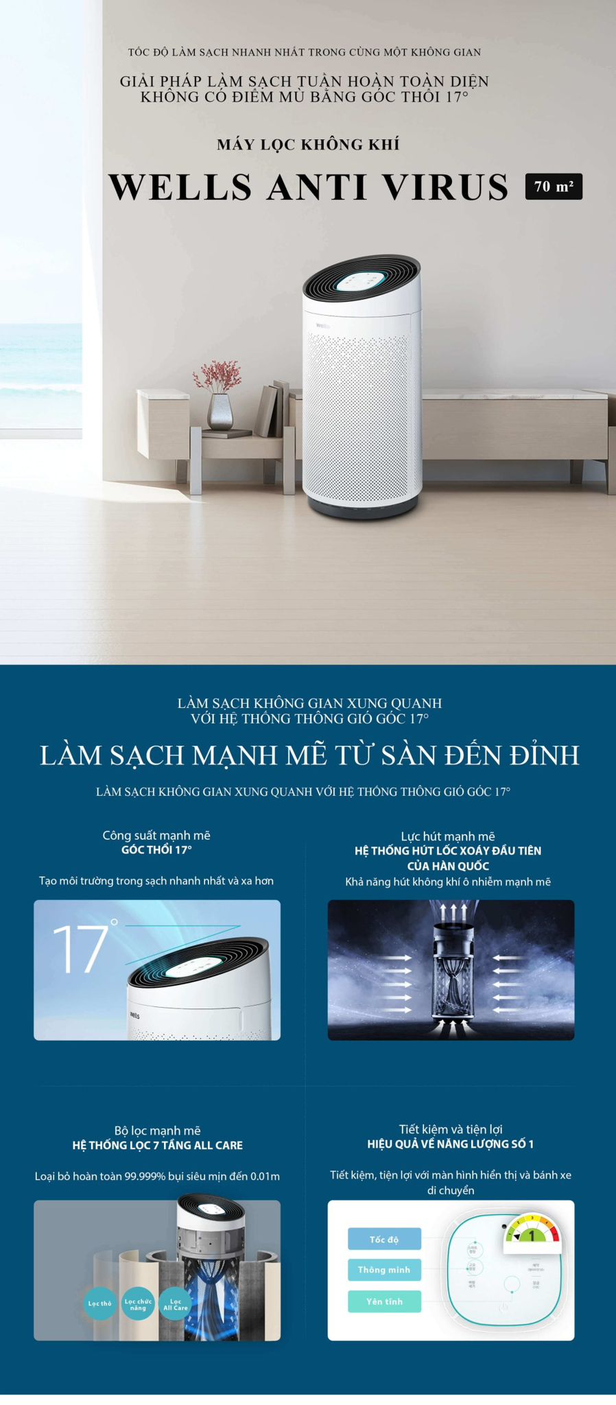 Wells Anti Virus là một trong những dòng máy lọc không khí đáng tin cậy, được sử dụng rộng rãi trong các căn hộ, chung cư, và những không gian lớn. Sản phẩm này nổi bật với bộ lọc All Care H14, được phát triển bởi các chuyên gia hàng đầu từ Hàn Quốc.