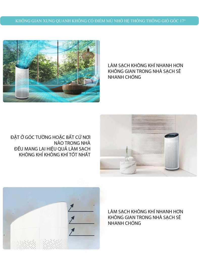 Máy vận hành với công suất 43W, độ ồn dưới 55dB, lọc sạch 99,999% bụi mịn PM1.0 và bụi siêu nhỏ (0.1um). Đặc biệt, thiết kế hệ thống lọc lốc xoáy với góc nghiêng 17 độ giúp tăng hiệu suất lọc không khí.