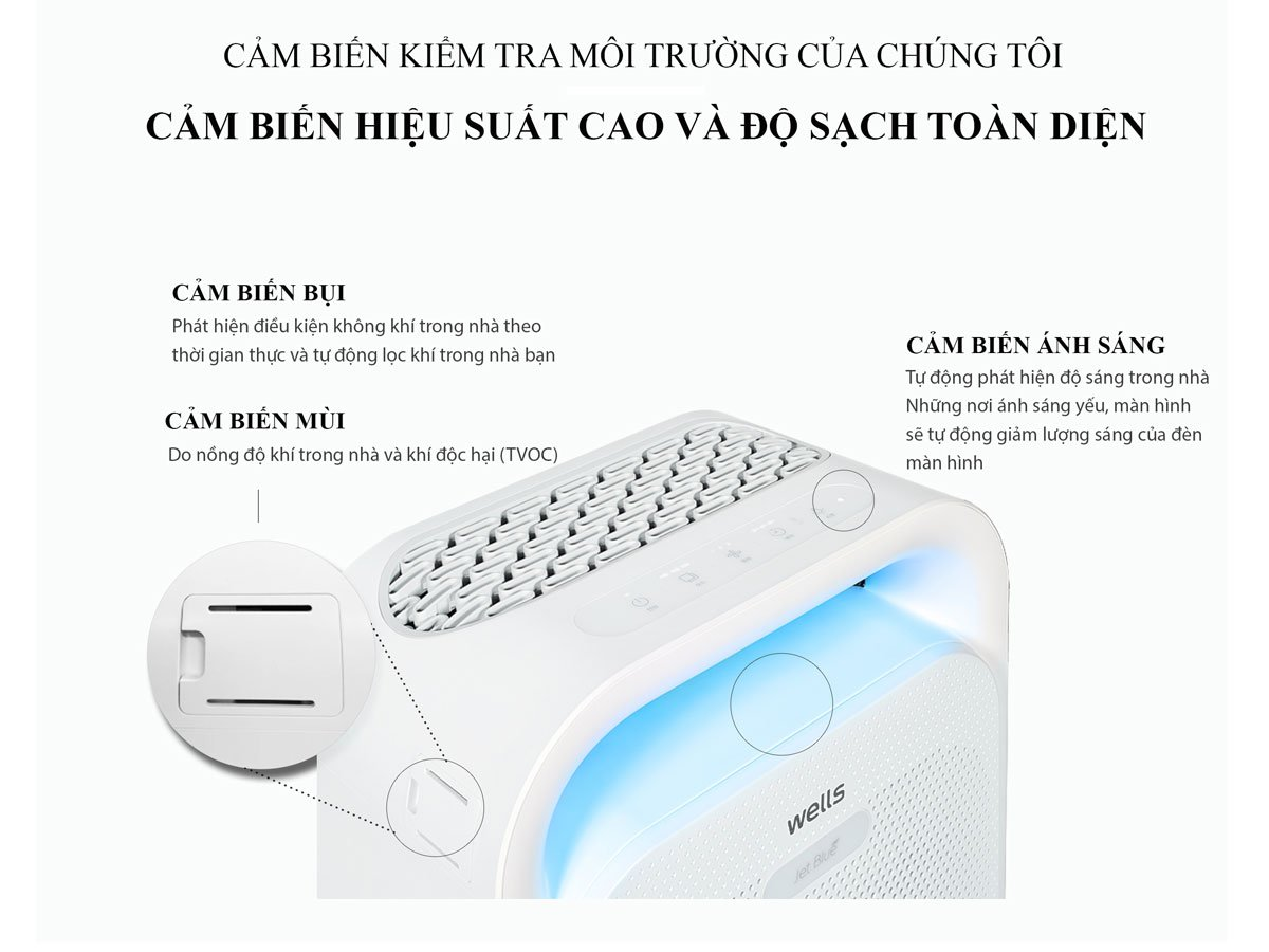 Máy lọc không khí Wells Jet Blue được trang bị ba cảm biến thông minh bao gồm cảm biến bụi, mùi, và ánh sáng, giúp máy kiểm tra và xử lý chất lượng không khí theo thời gian thực.