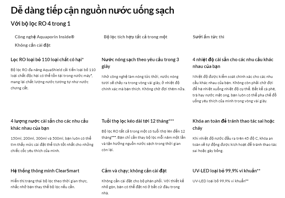 - Hệ thống lọc RO 4in1 giúp loại bỏ 99,999% vi khuẩn, virus, bụi, phèn và clo trong nước. Và công nghệ Aquaporin @inside giúp cải thiện chức năng lọc RO tối tân hơn.