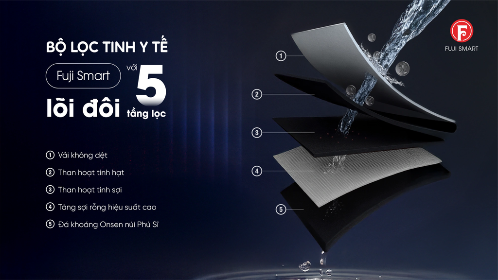 Máy được trang bị bộ lọc tinh y tế Fuji Smart lõi đôi với 5 tầng lọc: Vải không dệt, than hoạt tính hạt, than hoạt tính sợi, màng sợi rỗng hiệu suất cao và đá khoáng Onsen núi Phú Sĩ. Công suất lọc định mức đạt 16.000 lít, gấp 1.5–2 lần so với nhiều dòng máy khác. Bộ lọc loại bỏ hầu hết vi khuẩn và các chất độc hại như Clo dư, chì, kim loại nặng, hóa chất vĩnh cửu PFAS… đồng thời giữ trọn khoáng chất tự nhiên.