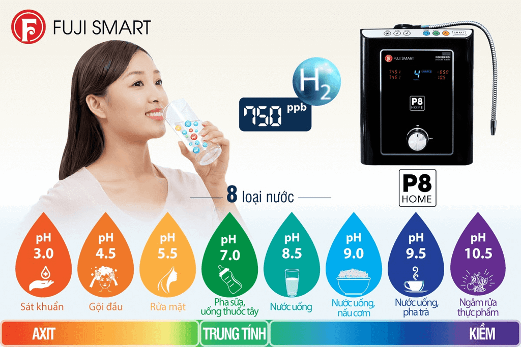 Một điều đáng lưu ý là Fuji Smart P8 Home tạo được cả nước iON kiềm mạnh dùng để ngâm rửa rau củ quả và nước iON axit mạnh để vệ sinh, khử khuẩn (điều mà một số dòng máy trong phân khúc giá rẻ chưa thể đáp ứng).