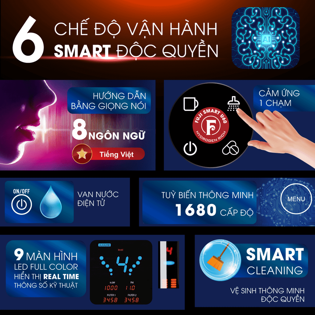 Với nguồn nước phức tạp như ở Việt Nam, tập đoàn Fuji đã tích hợp công nghệ tùy biến điện giải thông minh AI với 1680 cấp độ, giúp tự động phân tích áp lực nước, TDS, độ pH sau khi lọc cho máy điện giải Fuji Smart U60 HC. Từ đó, sản phẩm tự động tối ưu để tạo nước đầu ra có độ pH ổn định, nồng độ Hydro hòa tan vượt trội.