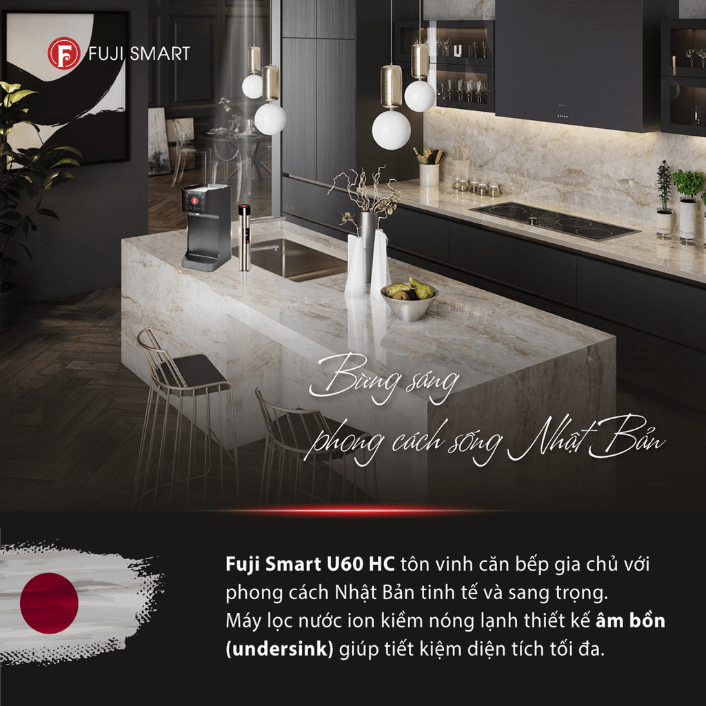 Fuji Smart U60 HC tôn vinh căn bếp gia chủ với phong cách Nhật Bản tinh tế và sang trọng. Đây là dòng máy lọc nước điện giải ion kiềm nóng lạnh thiết kế âm bồn (undersink) giúp tiết kiệm diện tích tối đa.