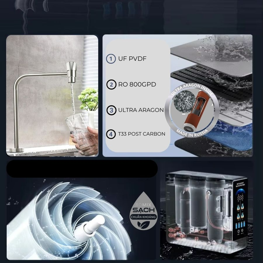 - Lần đầu tiên, công nghệ lọc nước RO( Công nghệ lọc khe hở hàng đầu hiện nay trên thị trường) được kết hợp với công nghệ lọc giữ khoáng thế hệ mới nhất của Geyser là Ultra Aragon 6 in 1 bằng công nghệ ROMIX giúp kiểm soát hàm lượng khoáng dầu ra ở ngưỡng mong muốn 1 cách dế dàng