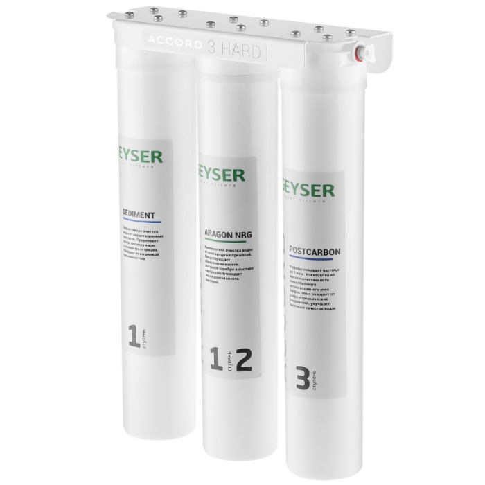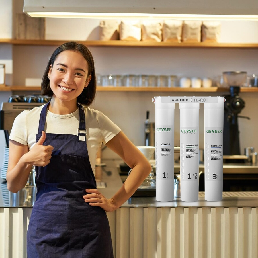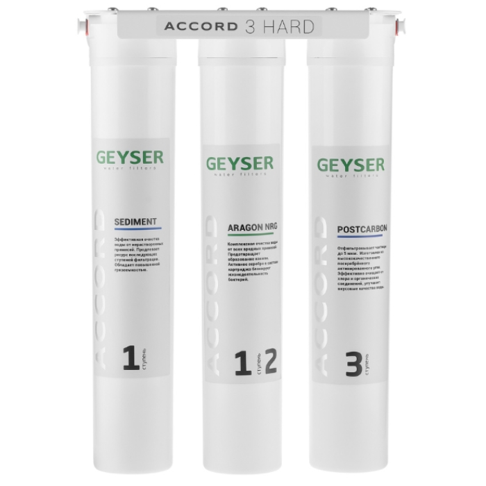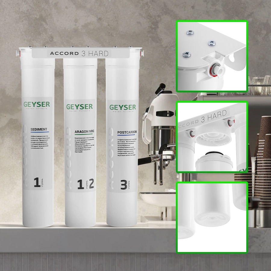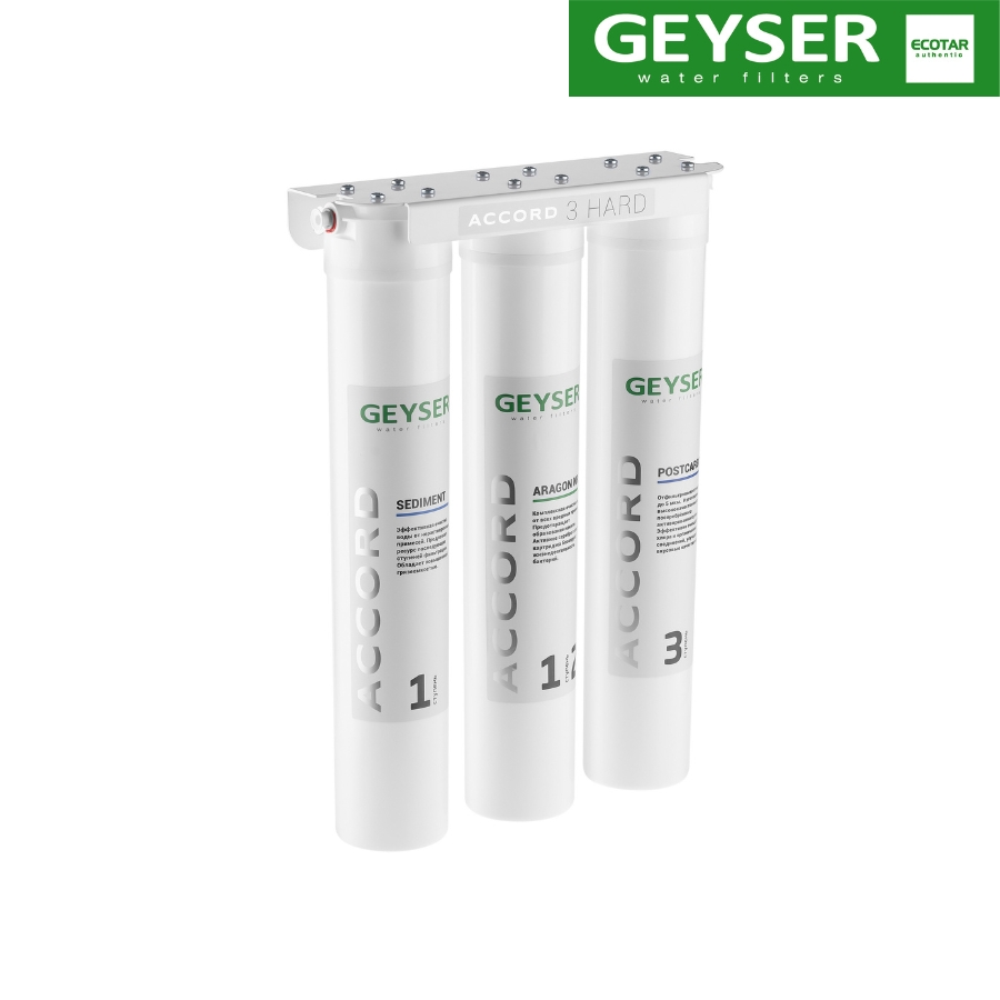 Geyser Accord 3 Hard là bộ lọc ba giai đoạn nhỏ gọn được thiết kế đặc biệt để cải thiện hiệu suất của nước lạnh từ hệ thống nước trung tâm được sử dụng trong các thiết bị thương mại, thiết bị làm đá và cà phê chuyên nghiệp. Bộ lọc đảm bảo điều chỉnh thành phần khoáng chất của nước nguồn, ức chế quá trình ăn mòn và hình thành cặn bám trên bộ phận làm nóng của thiết bị. Bộ lọc đưa nước đạt tiêu chuẩn cho phép bạn tối ưu hóa chất lượng của đồ uống và đá đã pha chế.