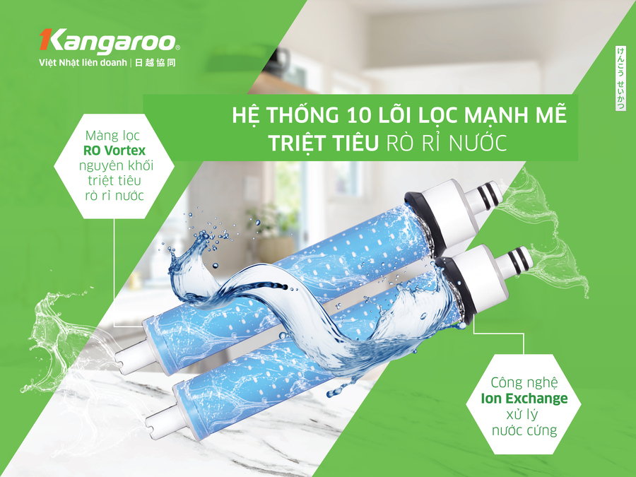 Máy lọc nước Kangaroo KG116I với 10 lõi lọc có khả năng lọc sạch hiệu quả. Nhiều công nghệ tích hợp: màng lọc RO Vortex 100 GPD sản xuất Hàn Quốc, công nghệ Nano Sliver làm sạch nước chống tái nhiễm khuẩn.