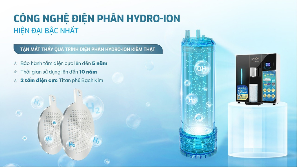 - Lõi điện phân Hydro-ion: Sử dụng 2 tấm điện cực Titanium mạ Bạch Kim quý hiếm, quan sát trực tiếp quá trình điện phân