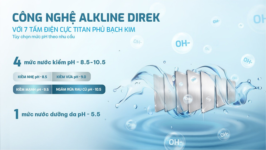 Công nghệ Alkaline Direk sở hữu sức mạnh của 7 tấm điện cực Titan phủ Bạch Kim quý hiếm, vận hành bền bỉ tới 10 năm, được bảo hành chính hãng 5 năm, miễn phí bảo dưỡng định kỳ dành riêng cho khách hàng đăng ký. Thiết kế điện cực dạng mắt lưới tăng diện tích tiếp xúc, nâng cao hiệu suất điện phân vượt trội, tạo hàm lượng Hydrogen tới 600 ppb và chỉ số ORP -300mV tối ưu.