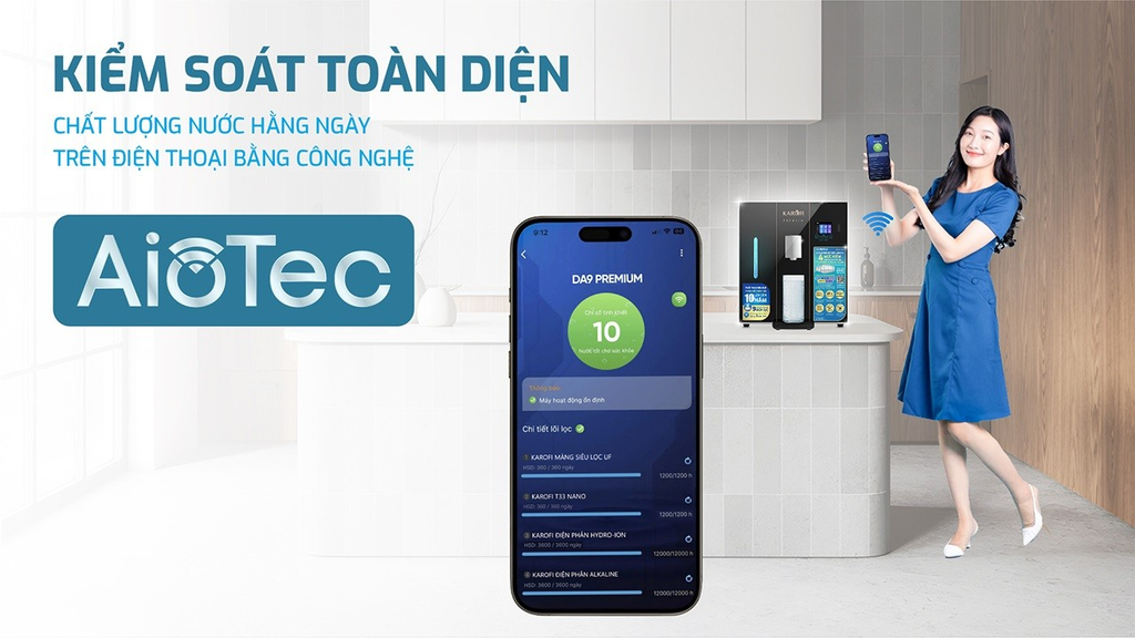 Máy lọc nước Hydro-ion kiềm Karofi DA9 PREMIUM tích hợp công nghệ AioTec thông minh, cho phép người dùng chủ động kiểm soát chất lượng nước sau lọc, cảnh báo thay lõi và kích hoạt bảo hành dễ dàng mọi lúc, mọi nơi, hoàn toàn yên tâm trong từng trải nghiệm sử dụng.