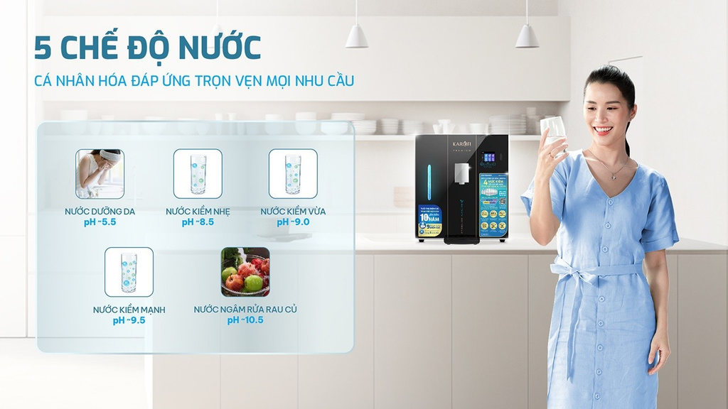 Karofi DA9 PREMIUM mang đến 5 chế độ nước chuyên biệt, đáp ứng đa dạng nhu cầu của cả gia đình, từ sinh hoạt hằng ngày đến chăm sóc sức khỏe tối ưu.