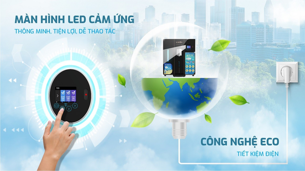 Máy lọc nước Hydro-ion kiềm Karofi DA9 PREMIUM sở hữu màn hình LED cảm ứng hiện đại, thao tác lấy nước nhanh chóng, mượt mà và chính xác chỉ với một chạm. Công nghệ Eco thông minh tự động tắt khi không sử dụng và phát sáng khi có người đến gần, vừa tiết kiệm điện năng, vừa mang lại trải nghiệm cao cấp trong không gian sống.
