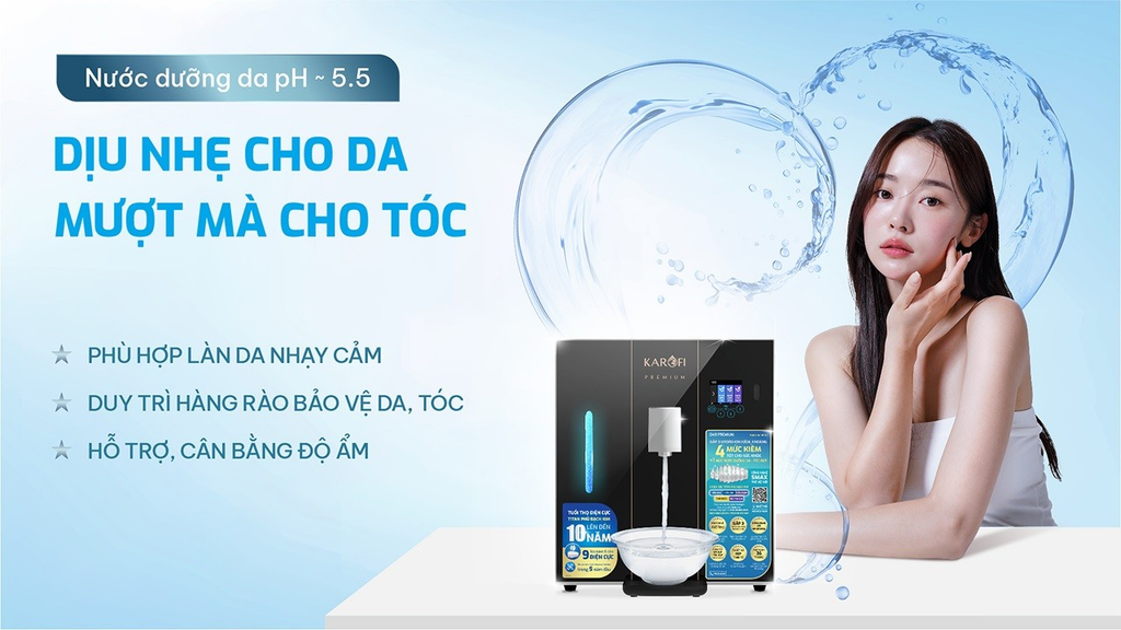 MÁY LỌC NƯỚC HYDRO-ION KIỀM KAROFI DA9 PREMIUM GẤP 3 HYDRO-ION KIỀM, KHOÁNG, 4 MỨC KIỀM TỐT CHO SỨC KHỎE + 1 MỨC NƯỚC DƯỠNG DA TÓC ĐẸP