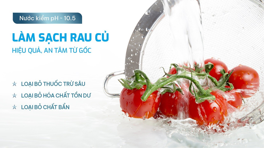 - Nước ngâm rửa rau củ (pH ~10.5): Giúp loại bỏ hóa chất và thuốc trừ sâu hiệu quả hơn, an toàn hơn cho bữa ăn.