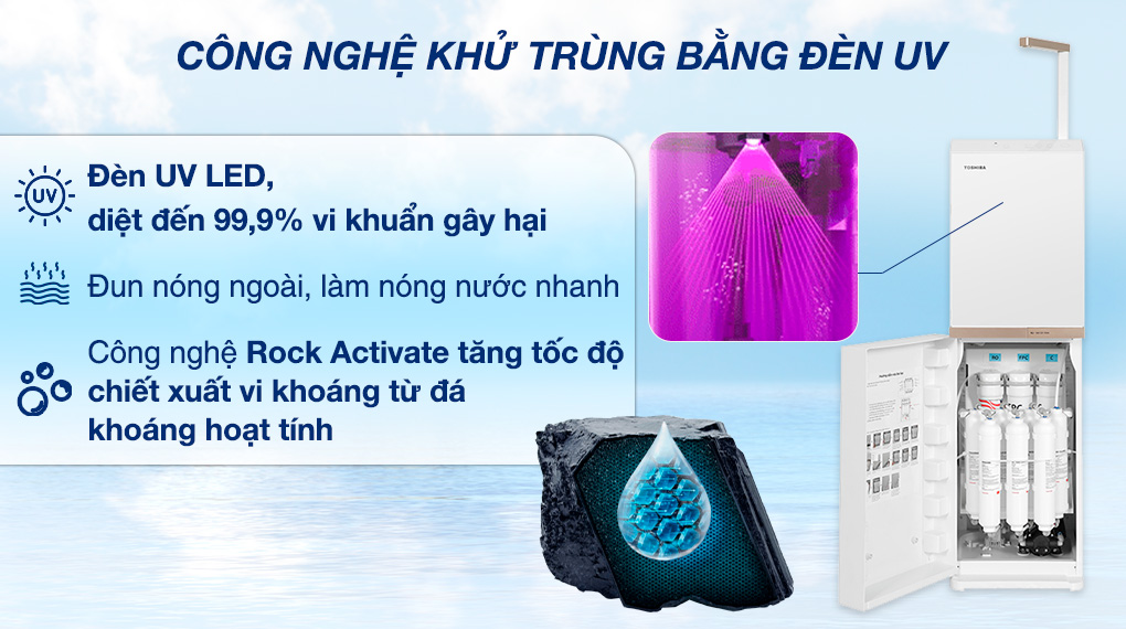 - Mẫu máy lọc nước Toshiba này được trang bị công nghệ kháng khuẩn bằng đèn UV diệt khuẩn.