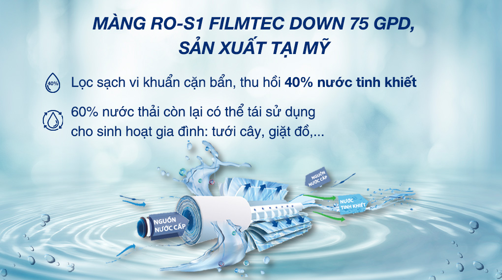 - Lõi RO 75 GPD Made in USA: Loại bỏ hơn 99,99% virus, vi khuẩn, kim loại nặng và các chất rắn hòa tan, giữ lại khoáng chất có lợi.