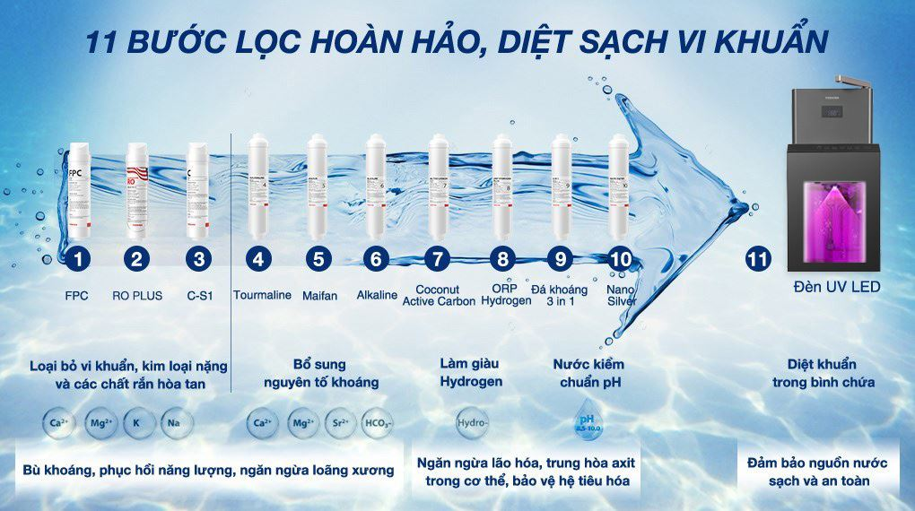 - Lõi chức năng: lõi Tourmaline, Maifan, Alkaline, Coconut Active Carbon, ORP Hydrogen, Đá khoáng 3 in 1, Nano Silver tái tạo ion âm, cung cấp thêm khoáng chất, bổ sung kiềm làm tăng độ PH, bổ sung Hydrogen, chống oxy hóa và tăng cường miễn dịch cho cơ thể.