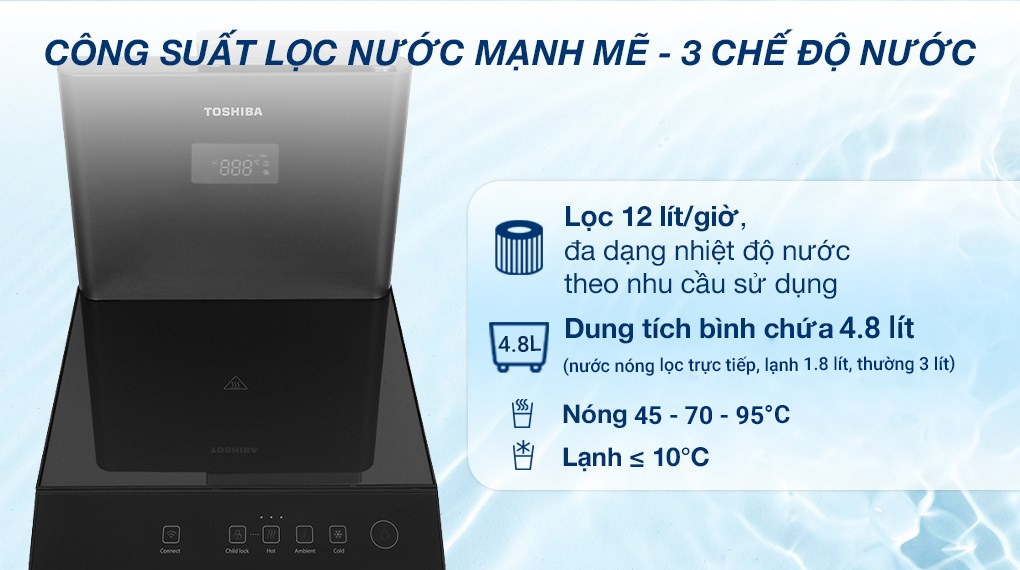 Máy lọc nước RO nóng nguội lạnh Toshiba TWP-W2399SVN(M) 10 lõi là sản phẩm lý tưởng cho gia đình bạn với thiết kế sang trọng, hiện đại, tính năng tiện lợi và khả năng lọc nước hiệu quả, an toàn.