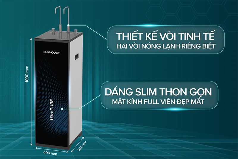 Sunhouse SHA76620KL có thiết kế slim thon gọn với kích thước 400 x 320 x 1000 mm, trọng lượng 34kg, kiểu dáng tủ đứng vuông vức đơn giản, tinh tế. Tổng thể sản phẩm mang phong cách hiện đại, dễ dàng kết hợp với nhiều không gian nội thất khác nhau như phòng khách, phòng bếp hay văn phòng. Mặt kính full viền tạo điểm nhấn sang trọng, đồng thời giúp tiết kiệm hơn 15% diện tích lắp đặt so với dòng máy lọc nước thông thường.