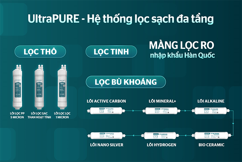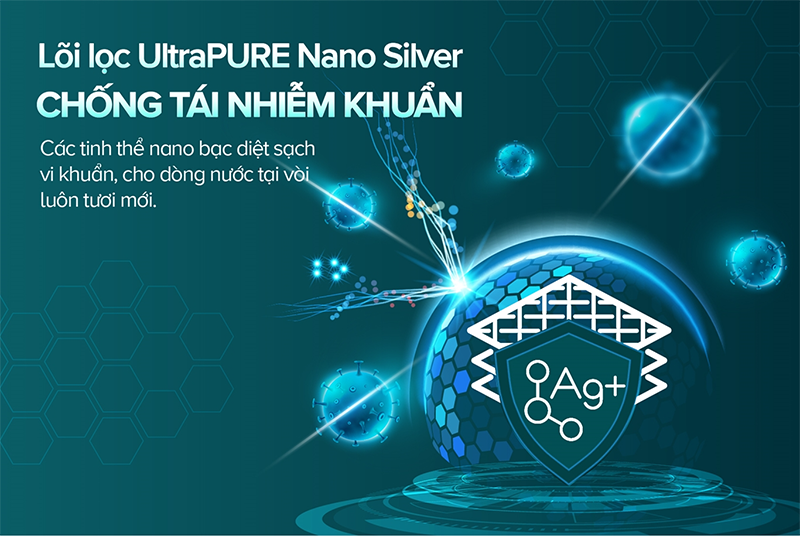 - Lõi Nano Silver: Tích hợp công nghệ bạc nano diệt khuẩn, khử mùi hiệu quả, đồng thời hỗ trợ cân bằng pH và tạo vị ngọt dịu tự nhiên cho nước.