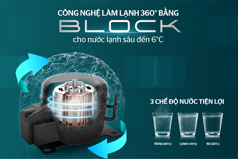 - Nước lạnh (khoảng 6°C): Thích hợp để giải khát trong những ngày nắng nóng, có thể uống trực tiếp mà không cần thêm đá. Công nghệ làm lạnh Block giúp nước lạnh sâu, làm lạnh nhanh và liên tục.