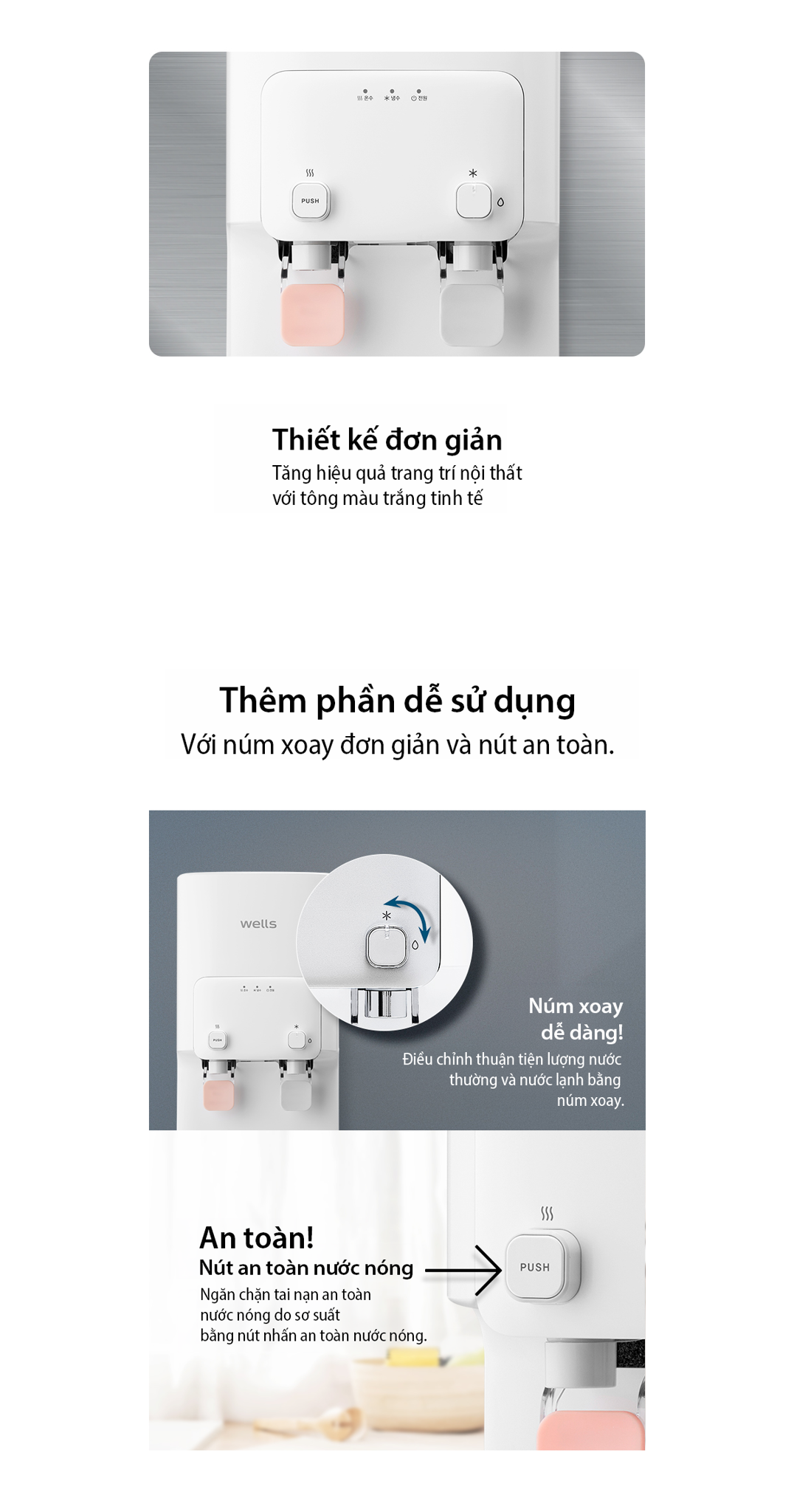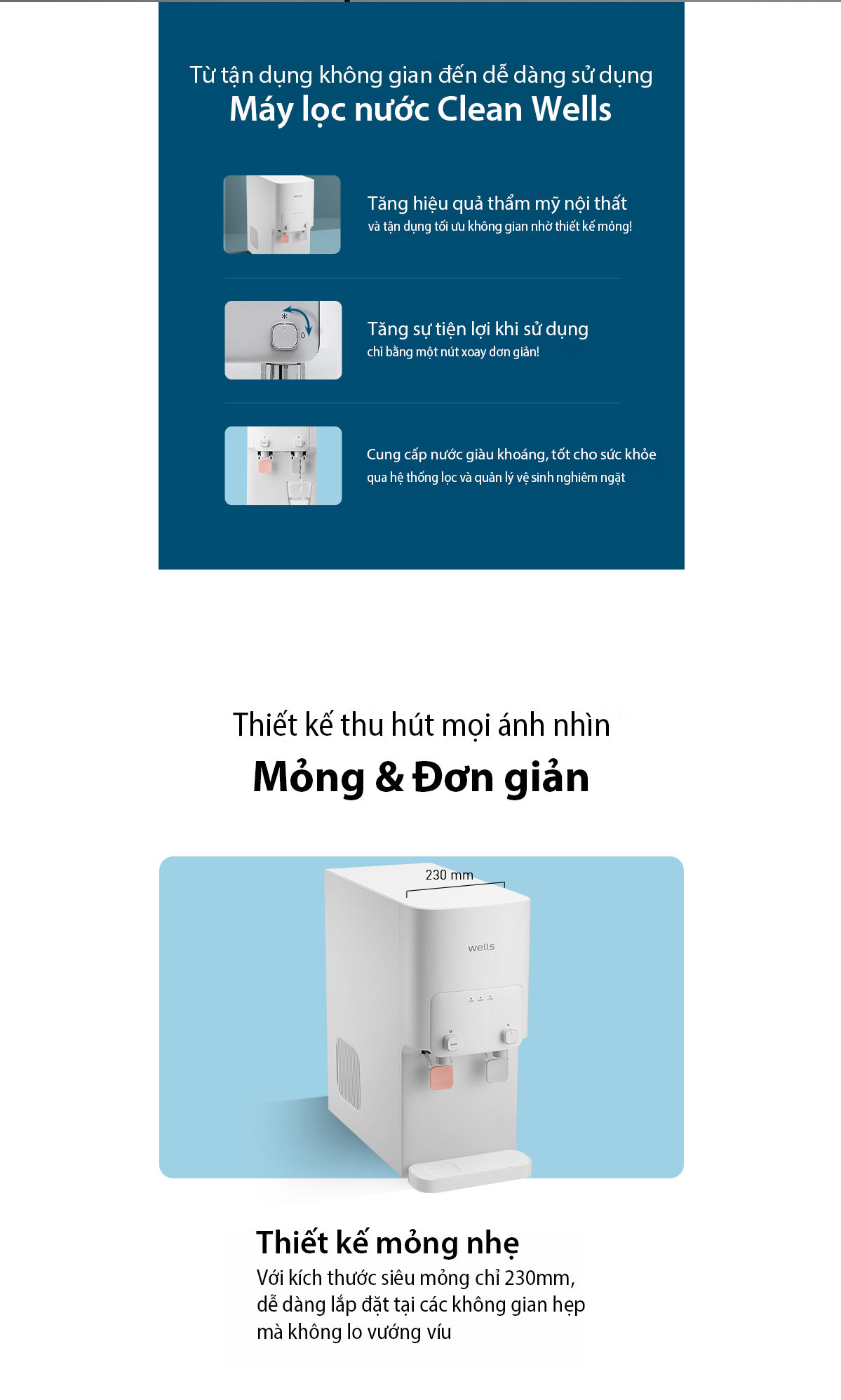 Máy lọc nước khoáng Wells Clean là giải pháp cung cấp nước sạch tiện lợi cho gia đình và văn phòng. Sản phẩm có thiết kế tối giản, kích thước nhỏ gọn chỉ 230mm, giúp tiết kiệm diện tích và dễ dàng lắp đặt trong nhiều không gian như phòng bếp, bàn làm việc hoặc quầy tiếp khách.