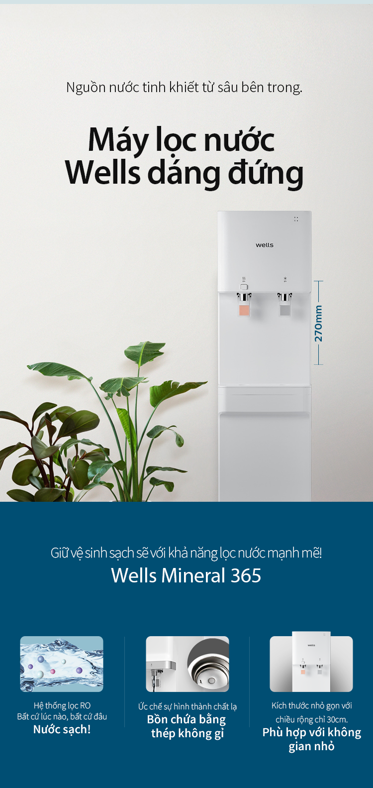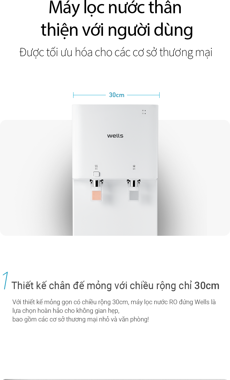 Máy lọc nước Wells dáng đứng có thiết kế hiện đại, gọn gàng với chiều rộng khoảng 30cm, phù hợp với nhiều không gian như căn hộ, văn phòng hoặc cửa hàng nhỏ.