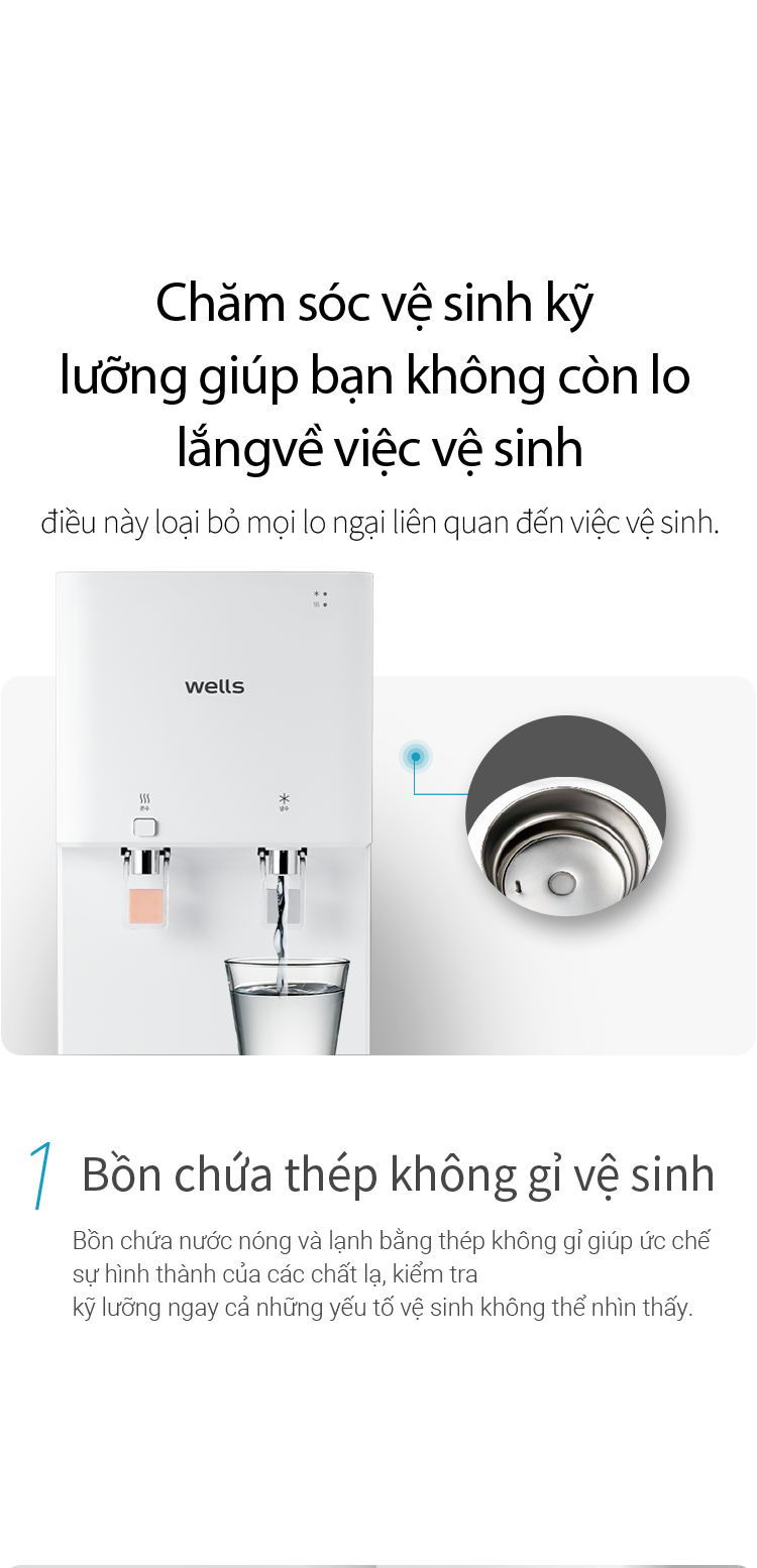Máy lọc nước Wells sử dụng bồn chứa bằng thép không gỉ, giúp hạn chế vi khuẩn và tạp chất hình thành trong quá trình sử dụng.
