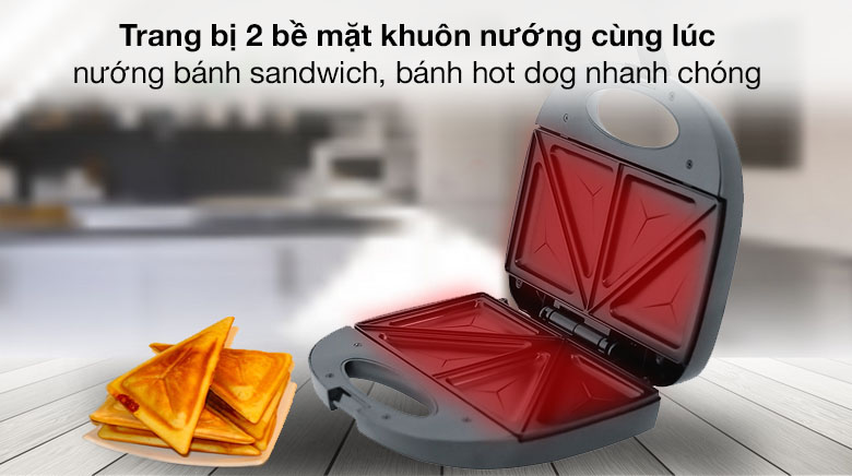 Máy được trang bị 2 bề mặt khuôn nướng, cùng lúc nướng được cả hai mặt giúp tiết kiệm thời gian chế biến.