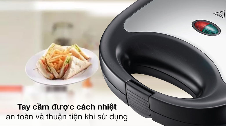 Bộ phận tay cầm được làm bằng nhựa cách nhiệt, cố định với thân máy rất chắc chắn, người dùng dễ dàng thực hiện các thao tác nâng lên đặt xuống và trở mặt bánh chín đều mà không lo bị bỏng.